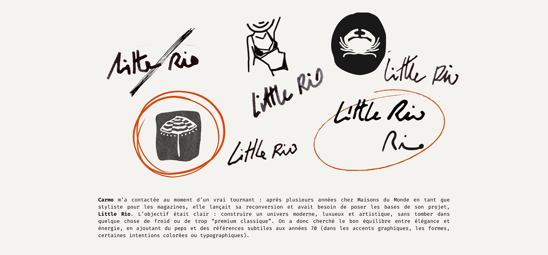 L’emblème de la marque : un parasol dessiné à la main, qui évoque à la fois le sud, le confort et une certaine douceur de vivre. La signature "Little Rio" a elle aussi été entièrement dessinée à la main, pour apporter du caractère, du mouvement et une vraie personnalité à l’ensemble.